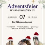 Wir laden alle PferdefreundInnen herzlich zu unserer Adventsfeier am Sonntag, den 3. Dezember ein. Euch erwarten spannende Reitvorführungen, Ponyreiten (gegen eine kleine Gebühr), Bastelangebote und vieles mehr. Neben dem tollen Programm sorgen wir mit leckeren Waffeln, Glühwein / Kinderpunsch und